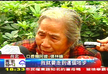 今年8月份,依舊在臺北車站附近擺地攤的她突然碰上劉姓、陳姓男子伸手搶糖,2男子稱若不給東西就拿150元新臺幣“交!保魣猿植荒缅X,就把她給打死,還把輪椅掀翻。張林蜂老婦哭訴道,她有時一天還賺不到50元新臺幣,還要負擔龐大醫藥費,實在是“沒法給”。張林蜂老婦表示,幸好遇見路人見義勇為將2人擒獲,并送交警方,要不然她真的不知道該怎么辦了。
