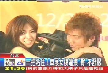 臺(tái)灣幾位美胸皇后被邀請(qǐng)作為車模亮相2010年臺(tái)北車展,低胸、小熱褲的打扮頓時(shí)吸引了不少粉絲、媒體圍觀。在主辦方安排的與粉絲互動(dòng)的環(huán)節(jié)中,幾位美胸皇后都遭遇男粉絲“咸豬手”。