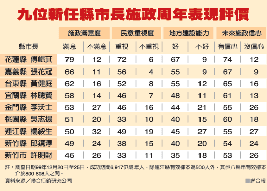 報道稱,這次調查主要從重民意、建設能力與施政滿意度總評3項指標,了解民眾對9位新縣市長的表現,也希望知悉民眾對未來施政信心有多高。