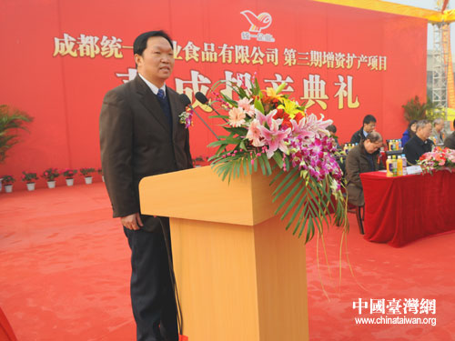 四川省臺辦副主任鐘遠超代表四川省臺辦對成都統一企業食品有限公司第三期增資擴產項目落成投產表示熱烈祝賀。鐘遠超在致辭中說,統一企業在四川生根開花結果,為地方社會經濟發展作出了貢獻。即將過去的一年,臺商投資四川取得了重要突破,富士康、仁寶、緯創等知名臺資企業紛紛到四川、成都投資,統一、臺玻、亞泥等在川臺資企業也在紛紛增資擴產。希望兩岸攜手,共創雙贏。
