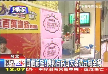 記者連續追問郭臺銘有沒有買彩券,郭臺銘則一抹神秘微笑不予回答。有網友表示,他親眼看到郭臺銘出現在土城中央路的彩券行。記者直接也前往彩券行求證。彩券行老板娘表示,幾乎可以確定就是郭臺銘,當時狀況就是一群人一起過來,好像是員工,他包了5個全餐。