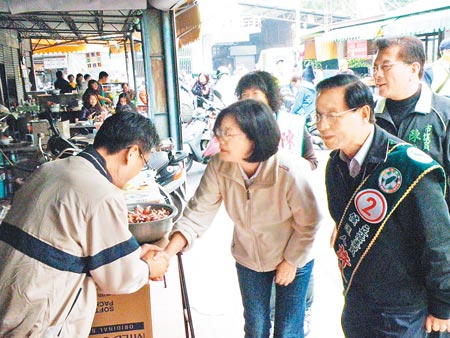 民進(jìn)黨提名的臺(tái)南“立委”補(bǔ)選參選人許添財(cái),昨天上午由蔡英文陪同前往市場(chǎng)拜票。