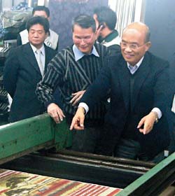 蘇貞昌(右)昨日參觀新北市印染廠,至于是否投入2012“大選”,他首度松口表示“正認(rèn)真考慮中”。圖片來(lái)源:臺(tái)灣《聯(lián)合報(bào)》