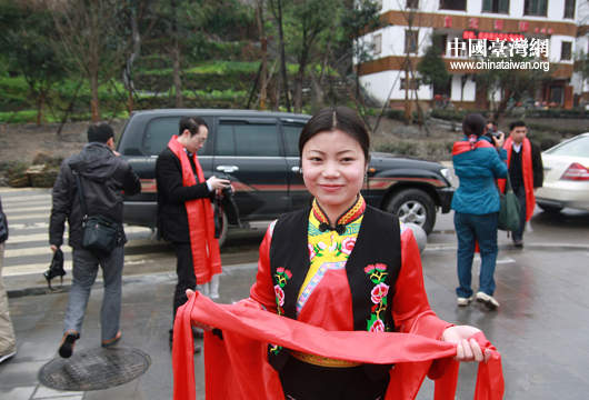 網(wǎng)絡(luò)媒體高層一進到水磨鎮(zhèn),熱情的羌族姑娘就給大家獻上羌紅哈達。(中國臺灣網(wǎng) 蕪?fù)?攝)