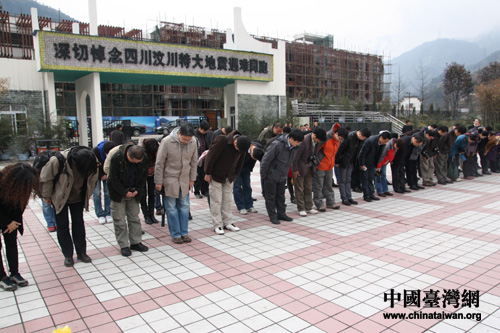 中國臺灣網3月26日四川汶川消息 日前,參加四川地震災區宣傳考察活動的全國網絡媒體高層一行,來到了“512”汶川地震震中的映秀鎮。在漩口中學紀念遺址前,全體人員懷著沉痛的心情向死難者默哀,并獻上菊花。