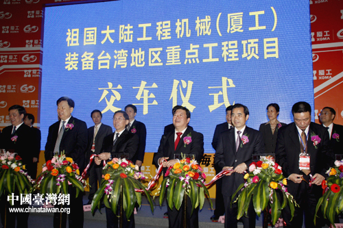 祖國大陸工程機械(廈工)系列產品裝備臺灣地區重點工程項目交車儀式今日在廈工館舉行。國務院臺灣事務辦公室副主任孫亞夫(右三)、福建省委常委、廈門市委書記于偉國等領導為交車儀式剪彩。(中國臺灣網 高斯斯 攝)
