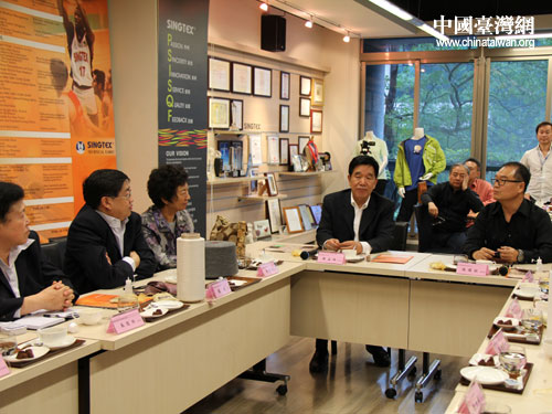 寧夏紡織產(chǎn)業(yè)考察團在臺灣興采實業(yè)股份公司考察、座談(前排右一為興采實業(yè)股份公司總經(jīng)理陳國欽,右二為寧夏自治區(qū)政協(xié)副主席解孟林,左三為寧夏自治區(qū)黨委副秘書長、臺辦主任張秀燕)。圖片來源:寧夏臺辦