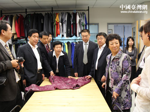 寧夏紡織產(chǎn)業(yè)考察團(tuán)考察臺灣興采實業(yè)股份公司研發(fā)的新面料(左二為寧夏自治區(qū)政協(xié)副主席解孟林,右二為寧夏自治區(qū)黨委副秘書長、臺辦主任張秀燕)。圖片來源:寧夏臺辦