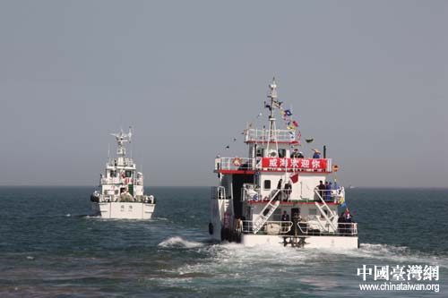 旅游船、海事船等組成的艦艇編隊駛向劉公島。(中國臺灣網 劉海偉 攝)