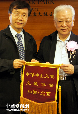 周鐵農代表參訪團一行向臺灣中華花藝文教基金會黃永川理事長贈送錦旗(圖片來源:民革中央)