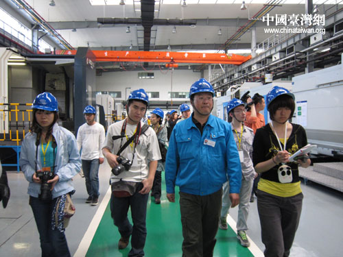 東汽黨委宣傳部副部長孫巖松帶領網媒記者參觀廣房。(中國臺灣網 朱毅 攝)