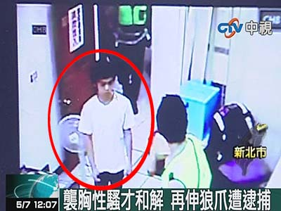 穿著白色上衣的男子先前犯下的性騷擾案才剛和解,又再度伸出狼爪。圖片來源:臺灣“今日新聞網”