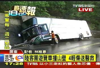 根據屏東警方調查,此一大陸旅行團來自上海,今日下午前往臺東時,在上述路段發(fā)生擦撞山壁的車禍,車禍發(fā)生原因,正由警方調查中。