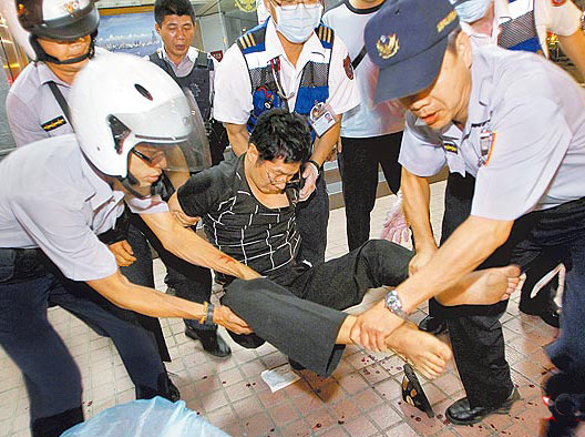 男子黃耀生在警察局門口持美工刀割手臂自殘,眾人合力將他制伏送醫。圖片來源:臺灣媒體