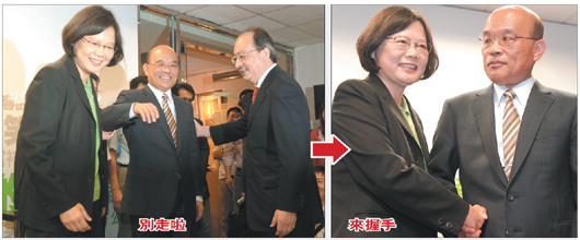 民進黨主席蔡英文與蘇貞昌19日“蔡蘇會”,氣氛略顯尷尬。在民進黨內大佬柯建銘要求下,蔡、蘇才“配合演出”,握手20多秒給媒體拍照,蘇貞昌還打趣說:“我頭發要不要梳一下?” 圖片來源:臺灣《聯合報》