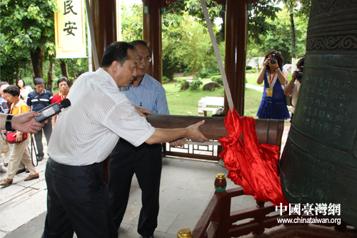 海南省臺(tái)辦副主任劉耿與臺(tái)灣新聞工作者協(xié)會(huì)理事長(zhǎng)陳萬(wàn)好共同撞響和平鐘(中國(guó)臺(tái)灣網(wǎng) 趙輝 攝)