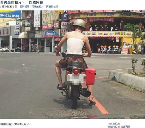 拍到“性感阿伯”的是臉書用戶“黃再晟”。他23日在馬路上發(fā)現(xiàn)“性感阿伯”,立刻拍下來上傳到臉書(Facebook),直呼“剛剛拍到的,穿這樣太猛了。”“真人真事親眼目睹,當(dāng)下震驚萬分!”據(jù)其它網(wǎng)友指出,拍照地點在彰化市中山路2段。