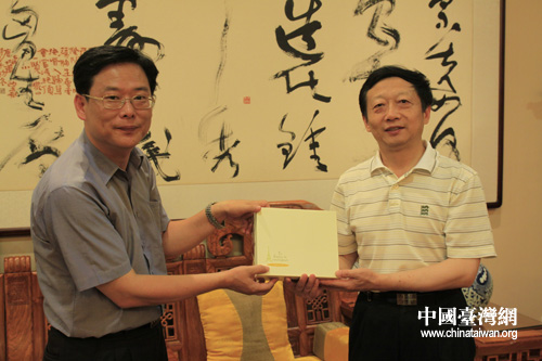宋慶齡基金會副秘書長喬健與臺灣十大杰出青年辦公室主任彭銘淵交換禮物。(中國臺灣網 趙婧 攝)