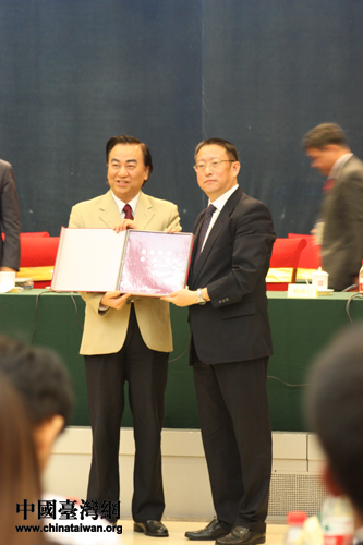 “杰青團”榮譽團長馮滬祥和鄭建邦互贈禮物。(中國臺灣網 馮江 攝)