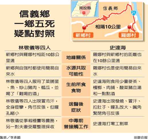 昨天離奇死亡的史達海住羅娜村,5人除林敬儀外,都是布農族少數民族;“出事”的2村(羅娜和新鄉村)相距約10公里。據臺媒了解,5人死狀都出現類似神經毒現象,不一樣的是,史達海的瞳孔放大,其他4人瞳孔縮小。