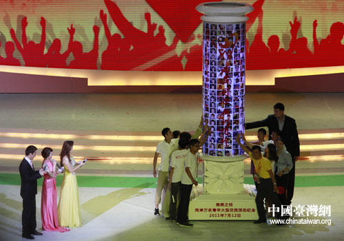 由中共中央臺辦、共青團中央等17家單位共同主辦的兩岸萬名青年大交流活動,7月上旬在大陸各地陸續展開。兩岸青年大型交流主題聯歡活動分為“我們同根”“我們同心”“我們同行”三個篇章,包括歌曲、舞蹈、武術、魔術等豐富多彩的文藝節目。孫楠、陳楚生、周杰倫、李宇春、林宥嘉、韓紅、成龍、宋祖英等一批深受兩岸青年喜愛的文藝明星先后登場,為大家獻上一首首耳熟能詳的具有中華傳統文化底蘊的歌曲,劉謙的魔術、河南少林寺武術、臺灣少數民族舞蹈、中國殘疾人藝術團的“千手觀音”也贏得現場觀眾的陣陣歡呼聲。