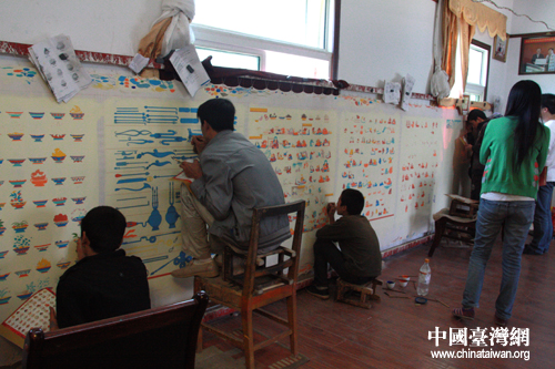 熱貢畫院辦公室主任龍措向記者們介紹唐卡的制作。(中國(guó)臺(tái)灣網(wǎng) 楊云濤攝)