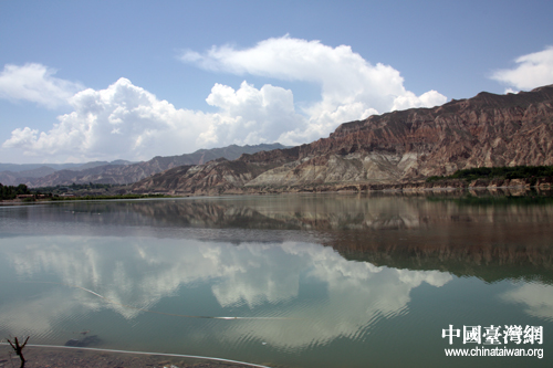 黃河之水青海來。黃河上游云、山的倒影在水中清晰可見。(中國臺灣網 楊云濤 攝)