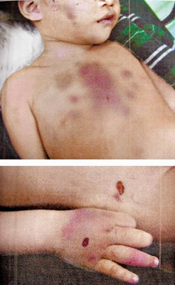 賴姓女童胸部有大片虐打傷痕(上),手腳也有煙頭痕跡(下)。圖片來源:臺(tái)灣媒體
