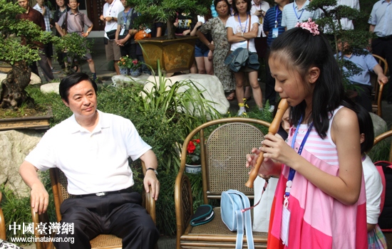 劉奇葆書記認真聆聽黃繹心小朋友的笛子演奏。(中國臺灣網 趙輝 攝)