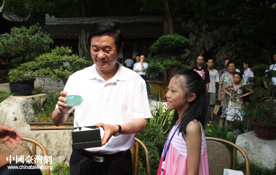 黃繹心小朋友將象征事事如意的琉璃柿子送給劉奇葆書記。(中國臺灣網 趙輝 攝)