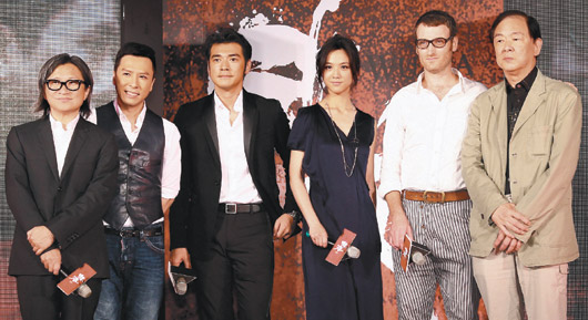 《武俠》昨天在臺首映,導演陳可辛(左起)、甄子丹、金城武、湯唯、攝影師Jake、王羽齊聚。圖片來源:臺灣《聯合報》