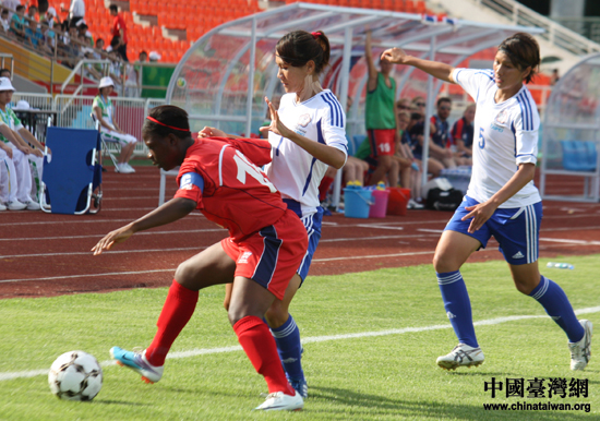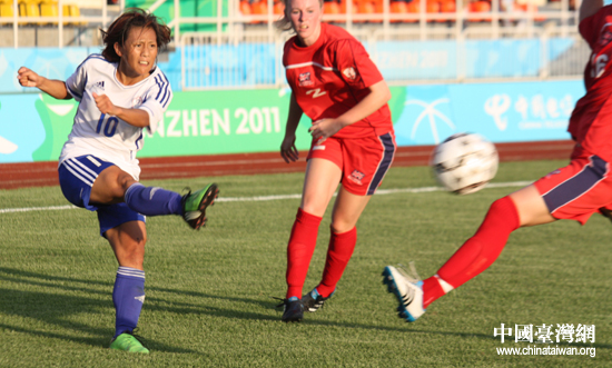 昨日比賽伊始,中華臺北隊即與對手展開激烈對抗,絲毫不懼英國球員人高馬大、強悍威猛,反而利用積極拼搶與順暢傳接不斷威脅對方腹地。第41分鐘,中華臺北隊球員沿左路帶球突進并吊中,10號曾淑娥禁區內搶點破門,改寫比分的同時也打入中華臺北隊深圳大運首粒入球。