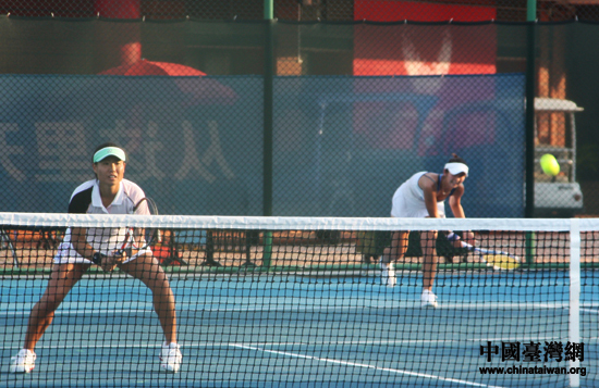 女雙比賽中,詹謹瑋(前)與許文馨(后)同御勁敵。(中國臺灣網 王思羽 攝)