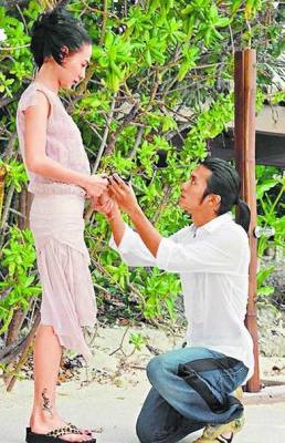 謝霆鋒(右)2006年秘密計劃菲律賓小島浪漫求婚行,他在海灘上拿出婚戒,下跪向張柏芝求婚。圖片來自網絡