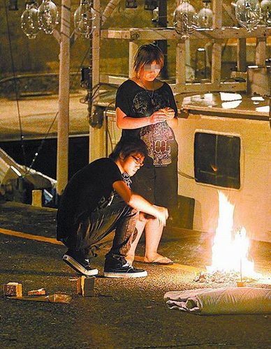 徐姓女子(右)見兒子遺體被打撈上岸,難過地幫兒子燒冥紙。圖片來源:臺灣媒體