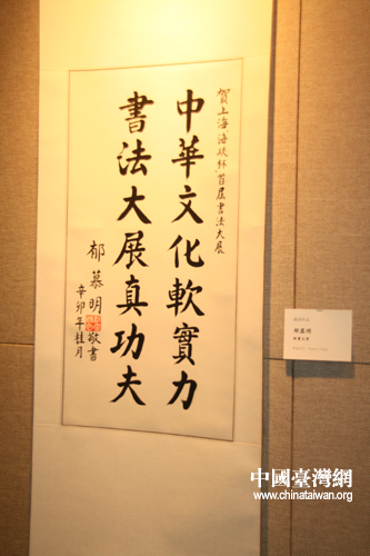 新黨主席郁慕明的書法作品“中華文化軟實力 書法大展真功夫”(中國臺灣網(wǎng) 李桂英 攝)