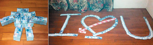 詐騙集團(tuán)成員在無名網(wǎng)站部落格,秀出用700多萬元現(xiàn)金排成的人形與“我愛你”圖案。(圖片來源:臺灣《聯(lián)合報》)
