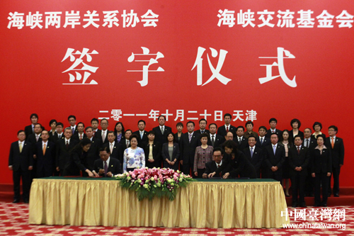 中國臺灣網10月20日天津消息 海協會會長陳云林與臺灣海基會董事長江丙坤20日下午2點30分在天津簽署了《海峽兩岸核電安全合作協議》,這是兩會自2008年6月恢復協商以來簽署的第16份協議。(記者 楊麗 陳佳慧)