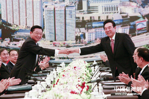 兩岸兩會領導人第七次會談于20日上午9時在天津迎賓館舉行,海協會會長陳云林與臺灣海基會董事長江丙坤握手致意。(中國臺灣網 陳佳慧 攝)
