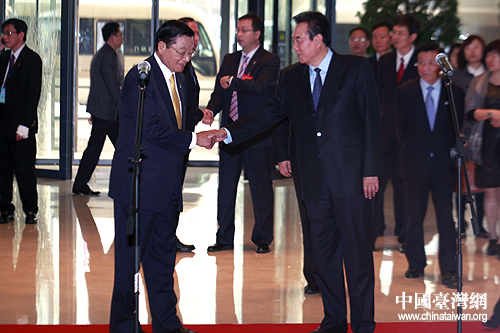 21日下午,海協(xié)會(huì)會(huì)長(zhǎng)陳云林在天津賓館與江丙坤率領(lǐng)的;鶗(huì)協(xié)商代表團(tuán)一行親切話別。(中國臺(tái)灣網(wǎng) 陳佳慧 攝)