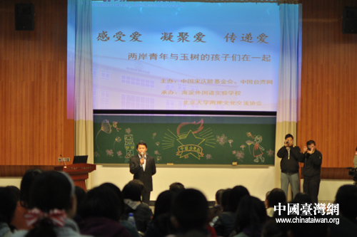 中國臺灣網10月24日北京消息 日前,由宋慶齡基金會與中國臺灣網主辦的“感受愛、凝聚愛、傳遞愛——兩岸青年與玉樹孩子們在一起”活動在北京完美落幕。北京大學兩岸文化交流協會來自臺灣、香港和大陸的40余位學子帶領著現就讀于北京市海淀外國語實驗學校的玉樹孩子們一起參觀了中山公園、宋慶齡故居等地,并在海淀外國語實驗學校進行了座談。