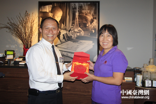 清華大學學生處教師曹愛紅與慈濟基金會秘書處專員劉鈞安交換禮物(中國臺灣網 徐維彬 攝)