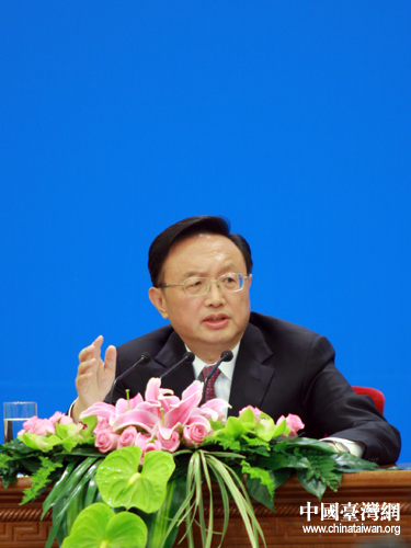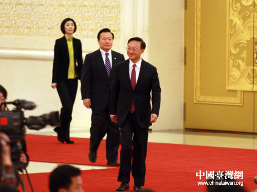 十一屆全國人大五次會議今天上午10時在人民大會堂三樓金色大廳舉行記者會。外交部部長楊潔篪向記者問候。(中國臺灣網(wǎng) 王偉 攝)