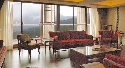 臺灣阿里山賓館總統套房客廳配有價值百萬新臺幣的檜木家具和擺飾,從房內可眺望山景。(圖片來源于臺媒)
