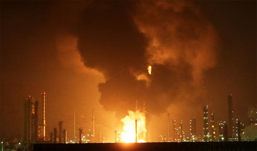 臺灣中油五輕楠梓煉油廠今天凌晨傳出爆炸聲響,工廠內火光直沖十層樓高,居民被巨大爆炸聲驚醒,烈火燃燒出有毒濃煙,伴著北風吹進高雄市區。圖片來源:臺灣《聯合晚報》