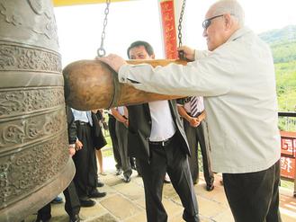 李登輝(右)日前為恒春生態農場的“綿鐘攬月樓”揭碑,并登上鐘樓,撞鐘33次。(圖片來源:臺灣《聯合報》)