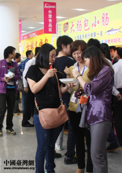 逛展市民開心分享臺灣小吃。(中國臺灣網 王思羽 攝)