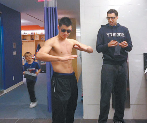 林書豪訓練結束后赤裸上半身,化身“林小龍”與隊友們打鬧,寄望球隊今天回到主場后,力阻熱火隊。