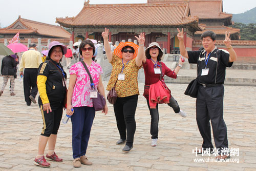 臺灣基層民眾游覽清東陵。圖為高雄區團員在乾隆帝的裕陵前合影留念。(中國臺灣網發 張成標 攝)