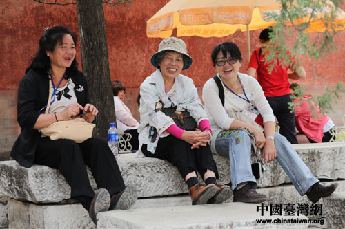 臺灣基層民眾游覽清東陵。圖為團員們在清東陵石凳上休憩。(中國臺灣網(wǎng)發(fā) 張成標 攝)